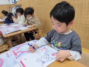 また、活動の合間の時間には絵描きクイズを行い、保育者の描いた絵を見て「わかった!」「○○じゃない?」と友だちと考え合いながら答えるなど、意欲的に参加して大盛り上がりのほしぐみさんでした🙌