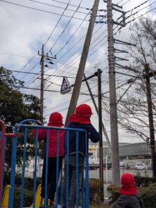 クライミングにも慣れ保育者の手を借りなくても自分で足の掛けるところを見て「あしここ?」と聞きながらスイスイ上れるようになっています。