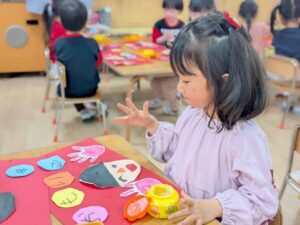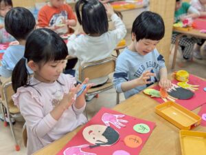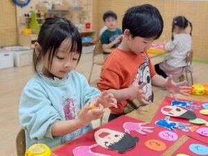 先日、にじ組最後の製作をしました‼️少しずつ細かいパーツも切れるようになってきたにじ組さんは、自分で顔のパーツや髪の毛を工夫して切り取りました😆✨
