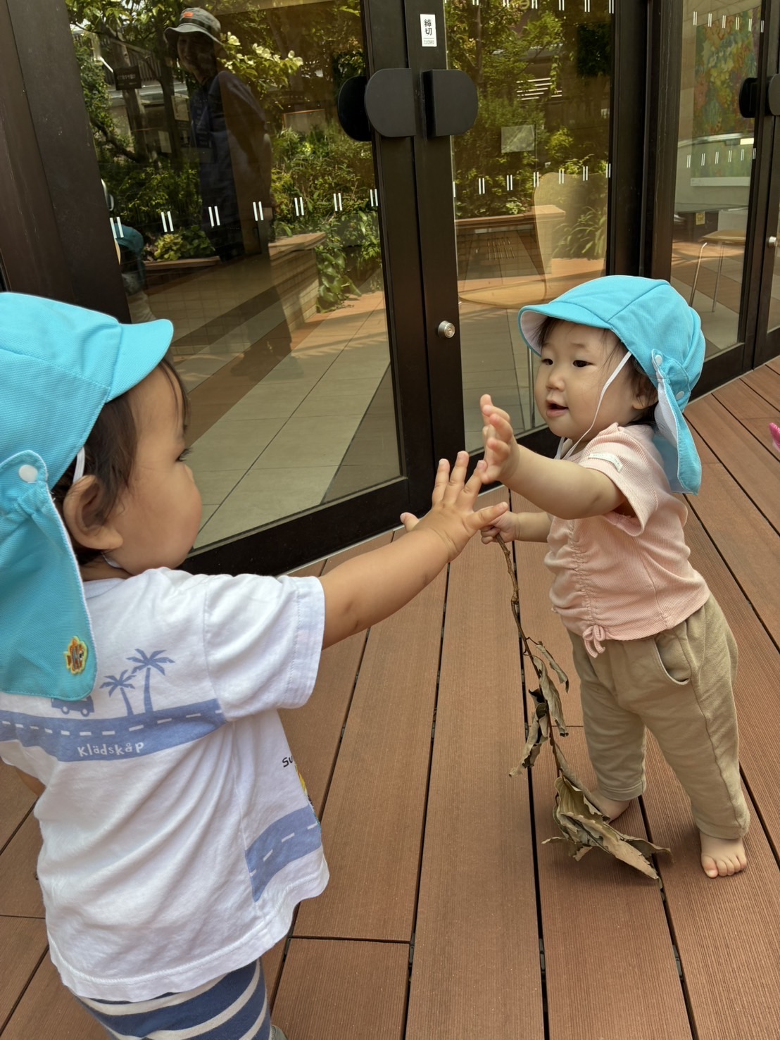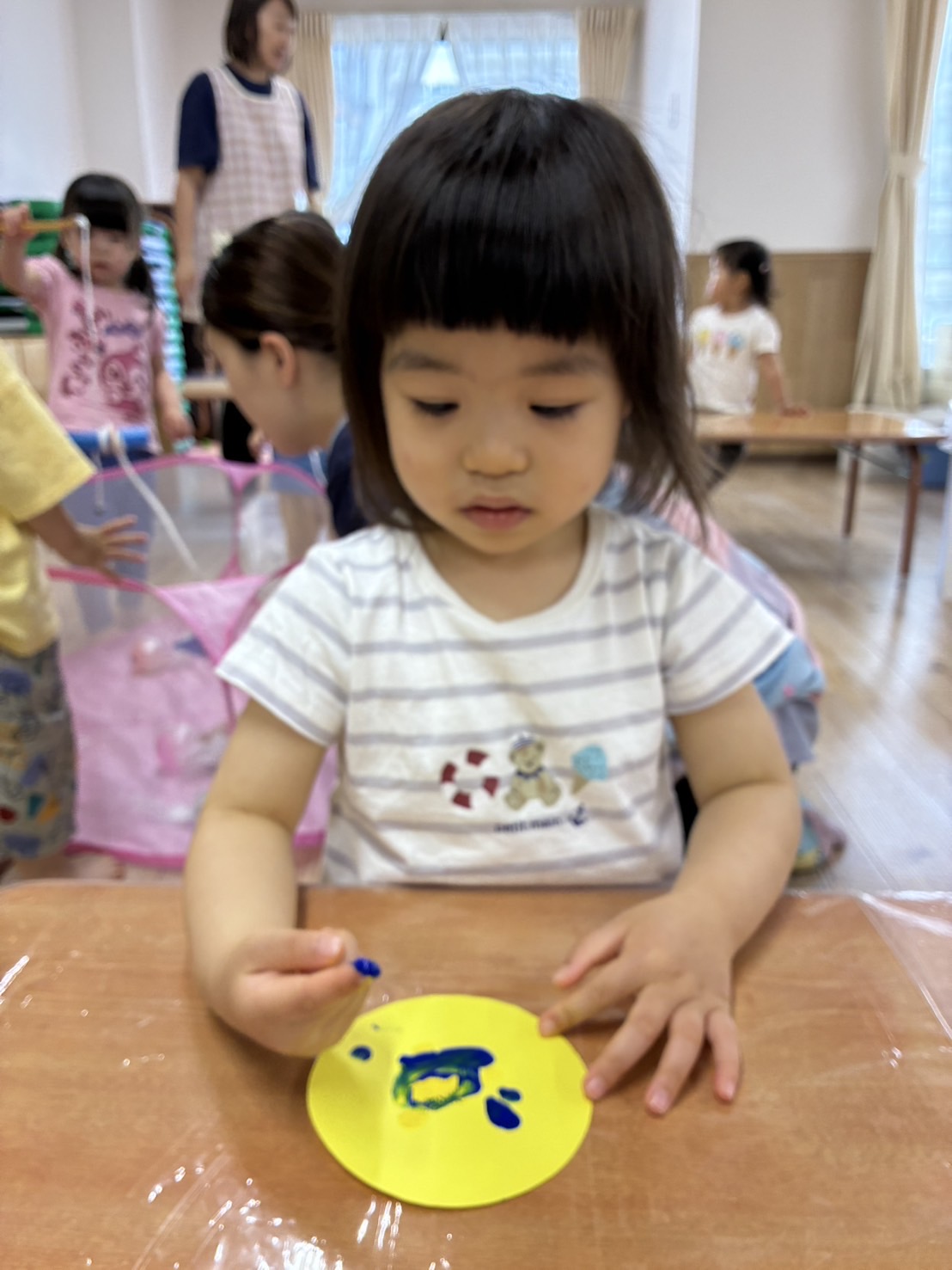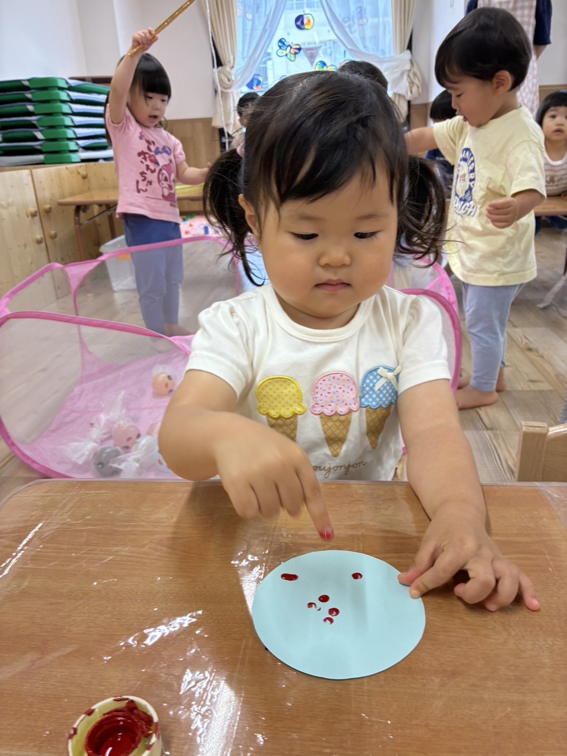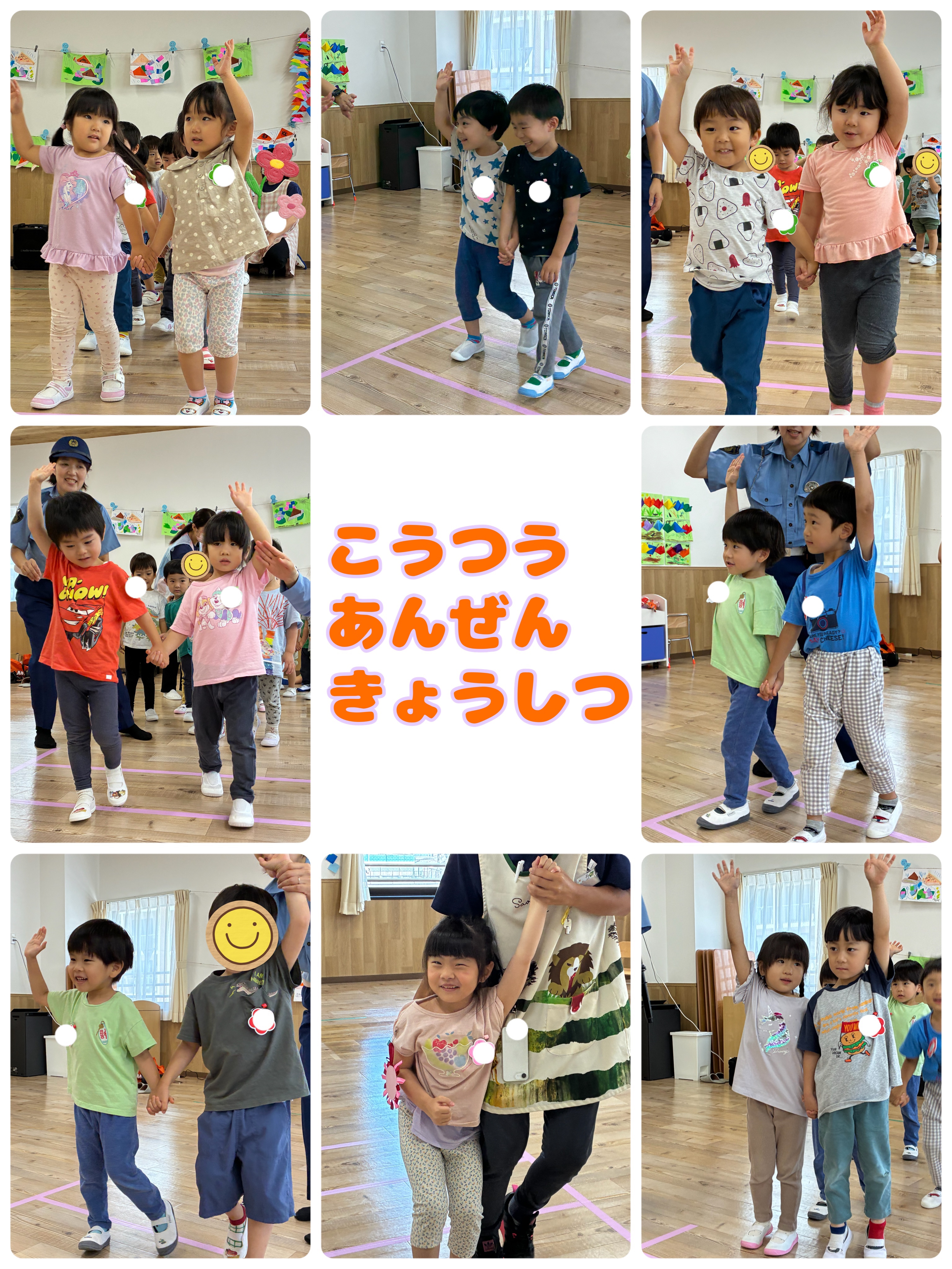 お部屋の中に横断歩道を作り、二人一組になって渡る練習!😊 手を挙げて、右見て、左見て、また右を見て…✨ 日頃の散歩から伝えていましたが、お巡りさんに教えてもらったことで、より意識が高まっているようでした✨