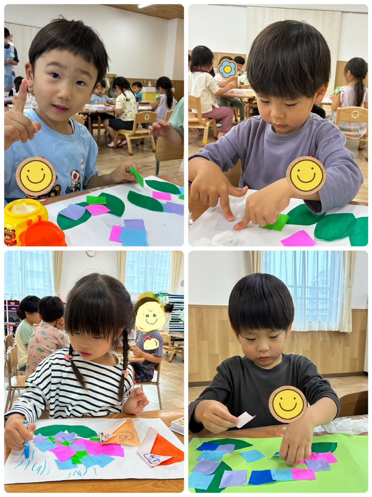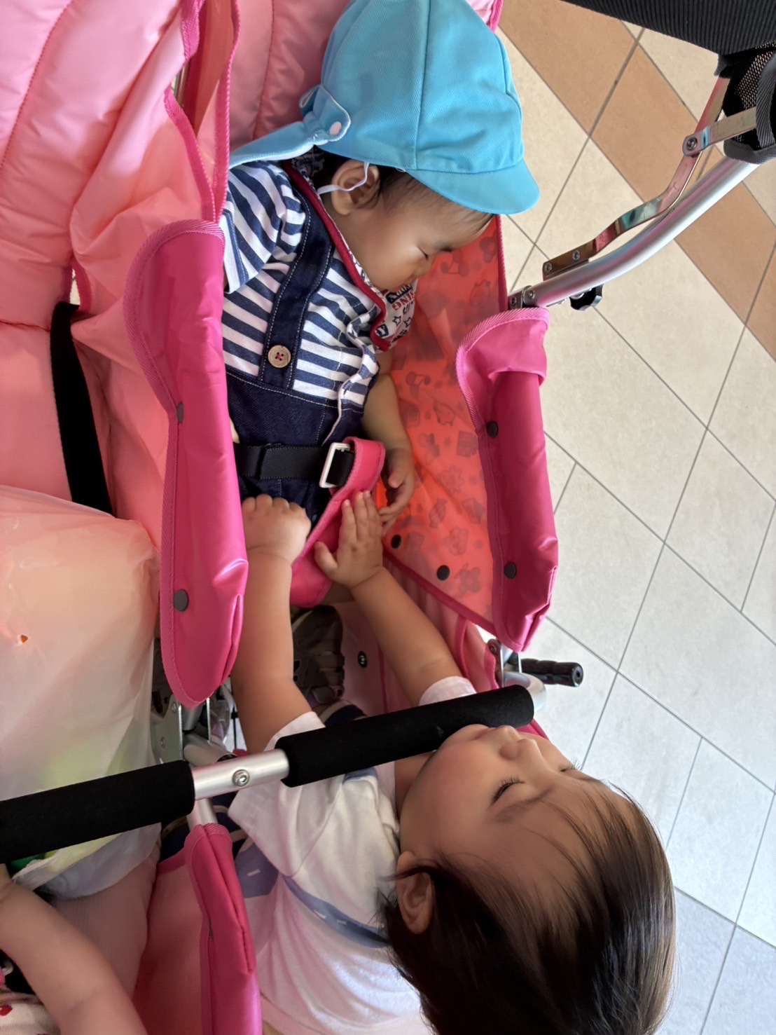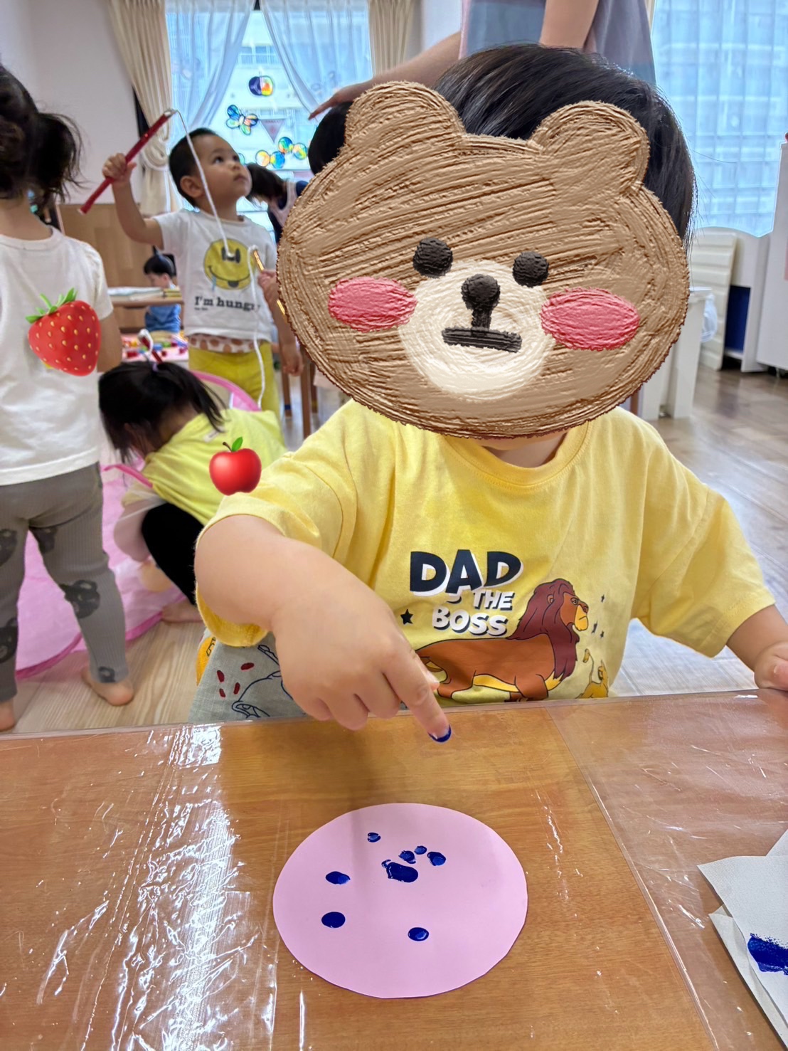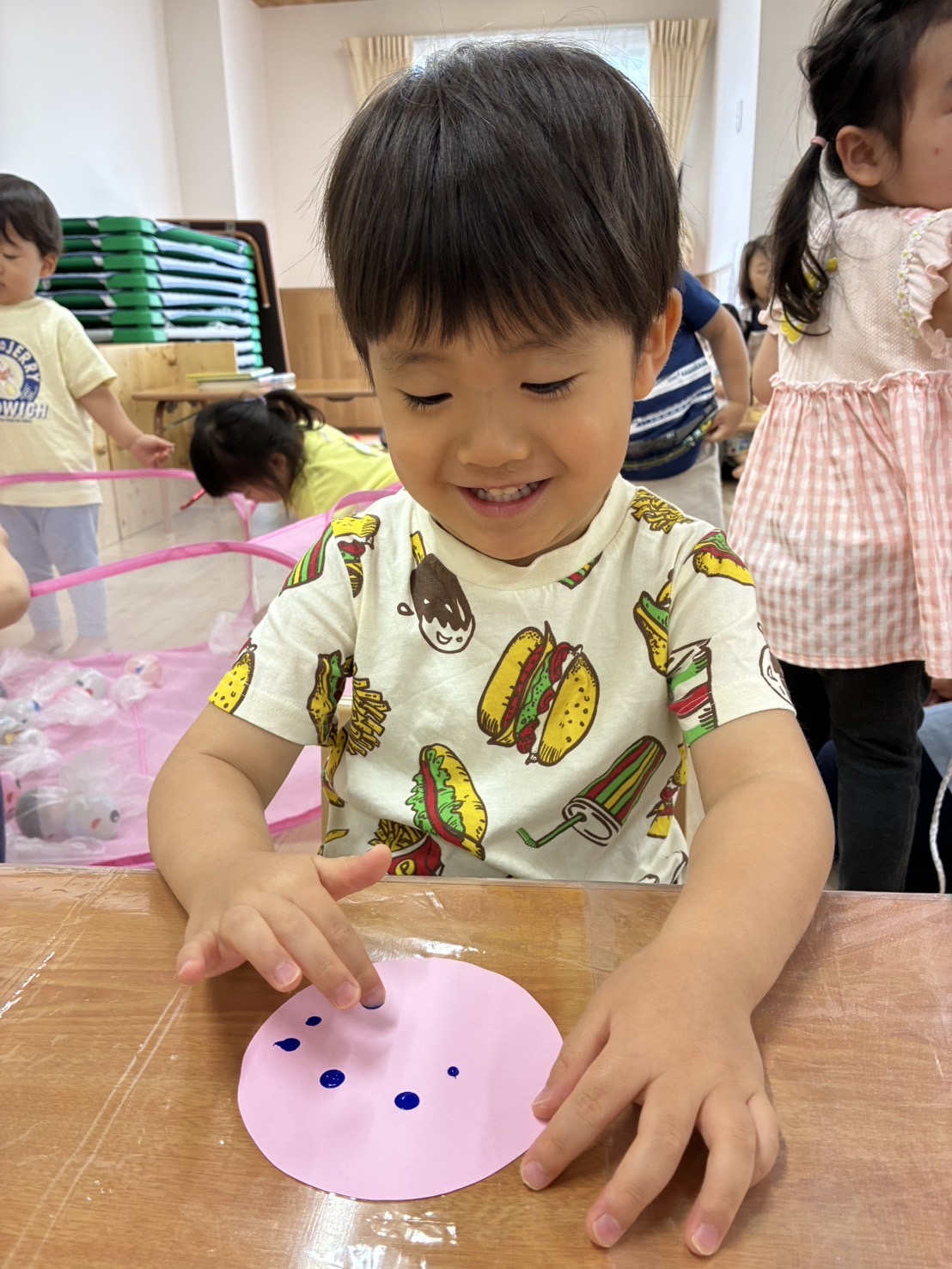 お部屋の中に横断歩道を作り、二人一組になって渡る練習!😊 手を挙げて、右見て、左見て、また右を見て…✨ 日頃の散歩から伝えていましたが、お巡りさんに教えてもらったことで、より意識が高まっているようでした✨