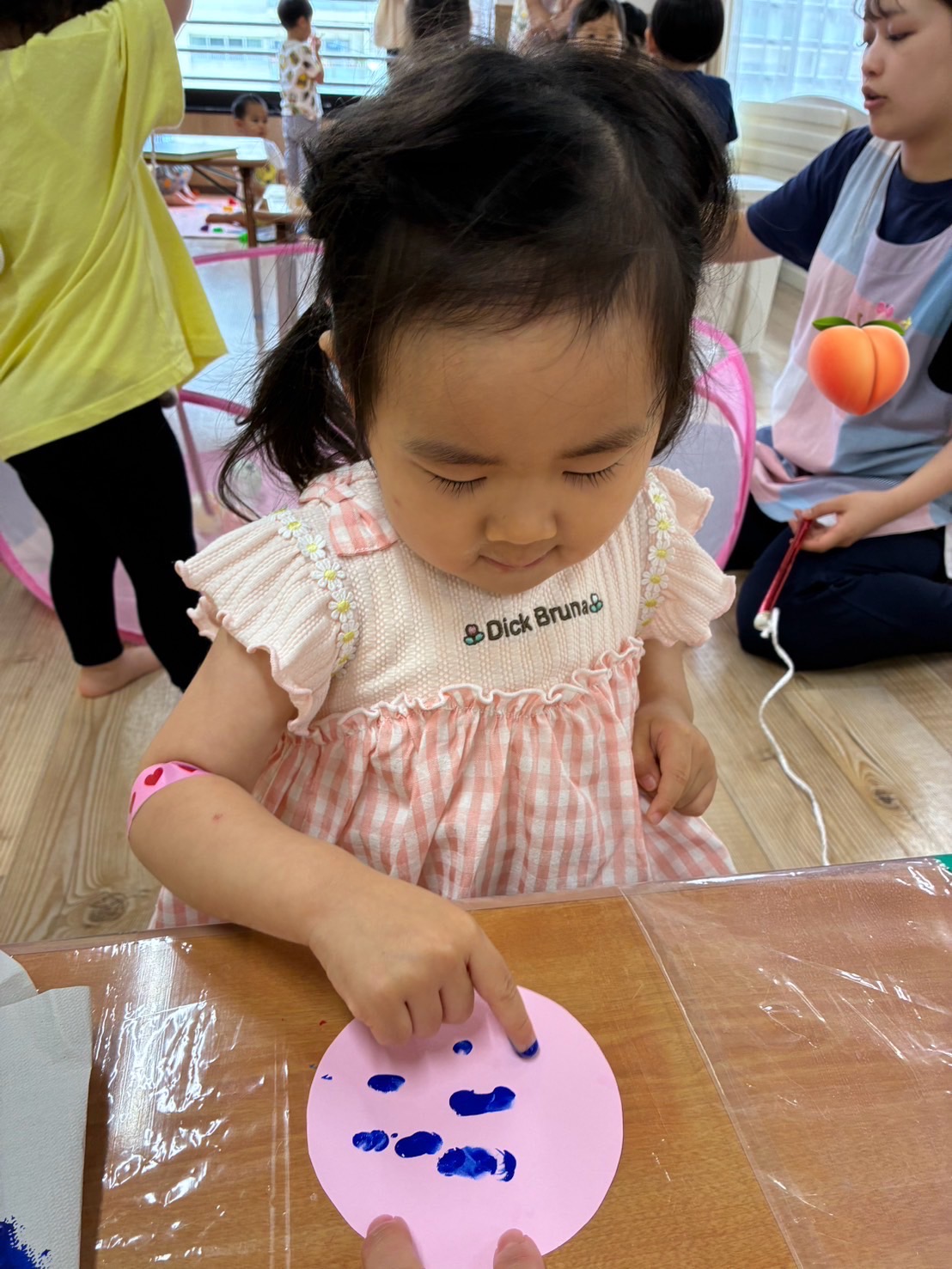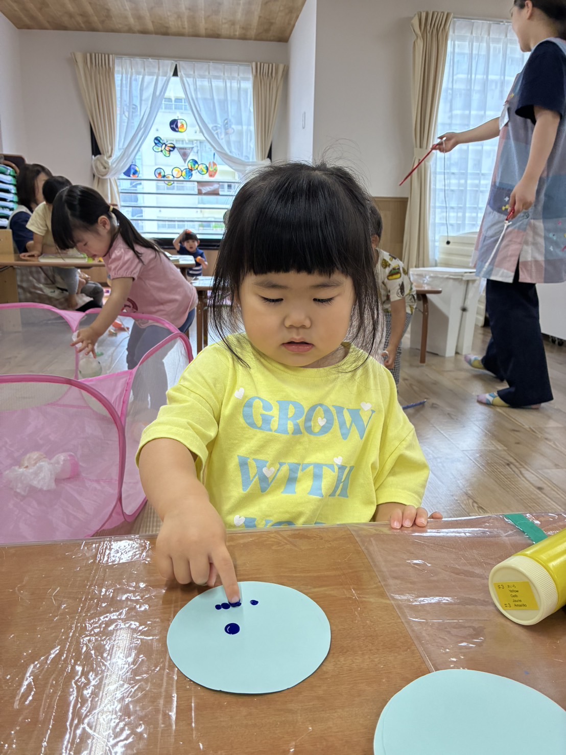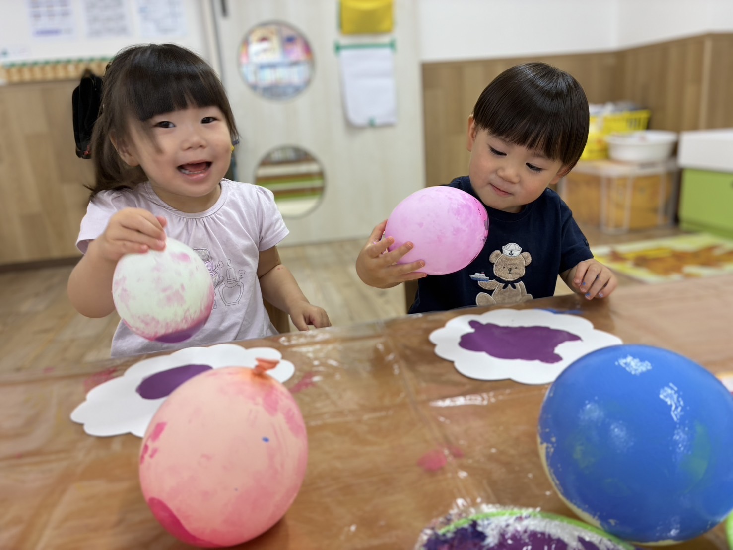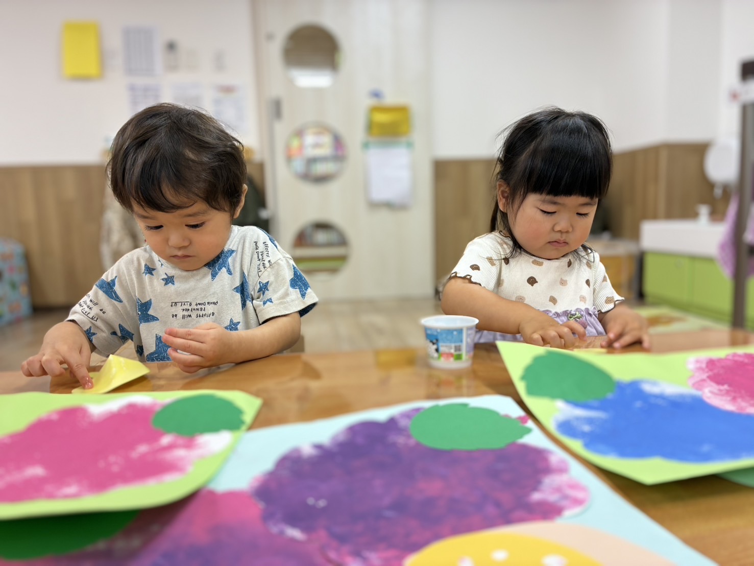 お部屋の中に横断歩道を作り、二人一組になって渡る練習!😊 手を挙げて、右見て、左見て、また右を見て…✨ 日頃の散歩から伝えていましたが、お巡りさんに教えてもらったことで、より意識が高まっているようでした✨
