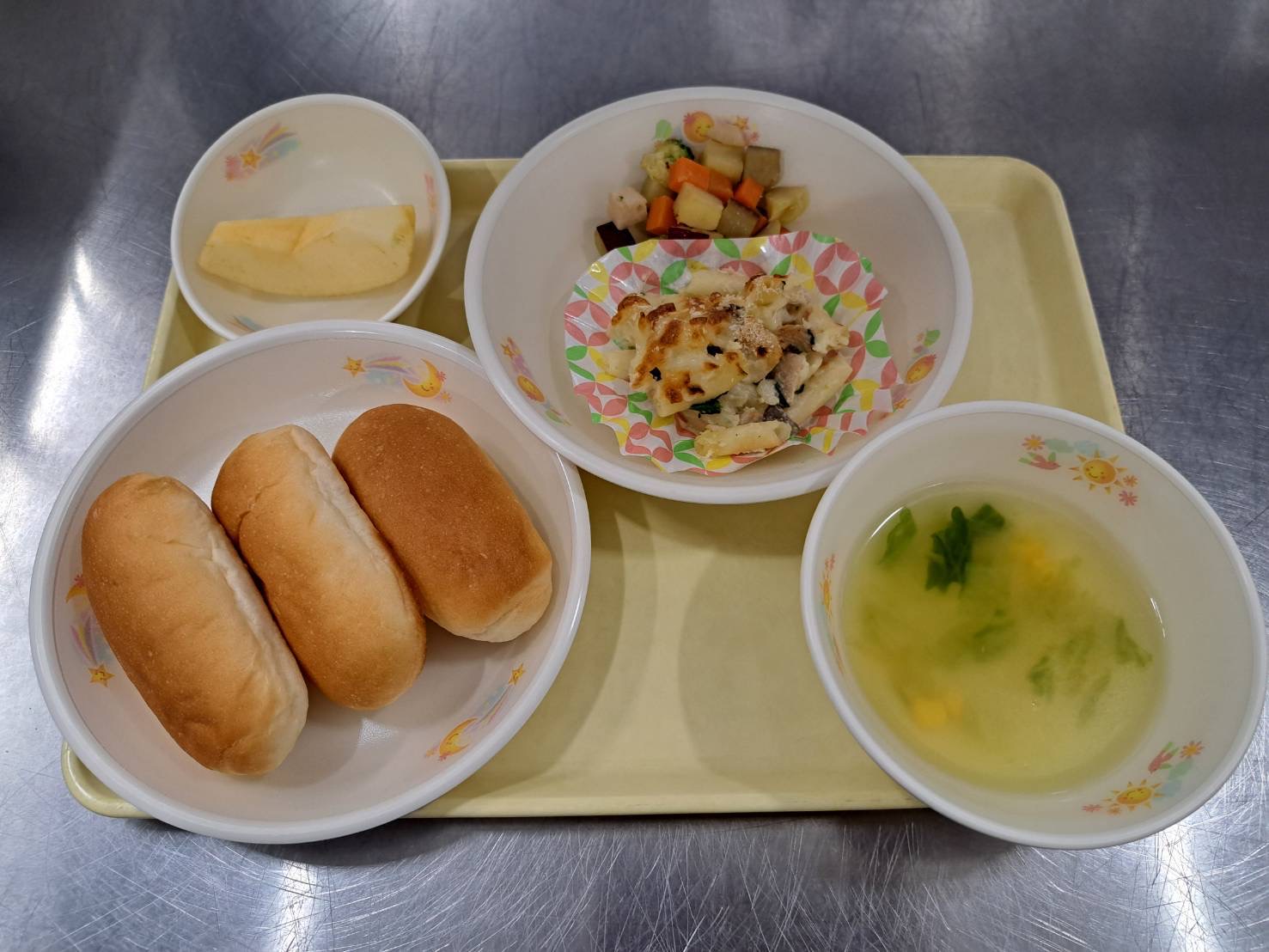 🎉誕生会メニューの紹介“1月”🎉 2026年02月18日 1月の誕生会メニューは、冬らしく「マカロニグラタン」にしました♪ 幼児さんはカラフルなカップに入れて提供したところ、とっても喜んでくれました😊いつもよりちょっと特別な演出をすることが大切だなぁと改めて感じることができました! おやつの誕生ケーキは、旬のミカンをジャムにして作りました🍊みんな美味しく食べていましたよ😋✨ 【お昼】 ・ロールパン ・マカロニグラタン ・彩り野菜のスープ ・洋風スープ ・りんご 【おやつ】 ・牛乳 ・誕生日ケーキ