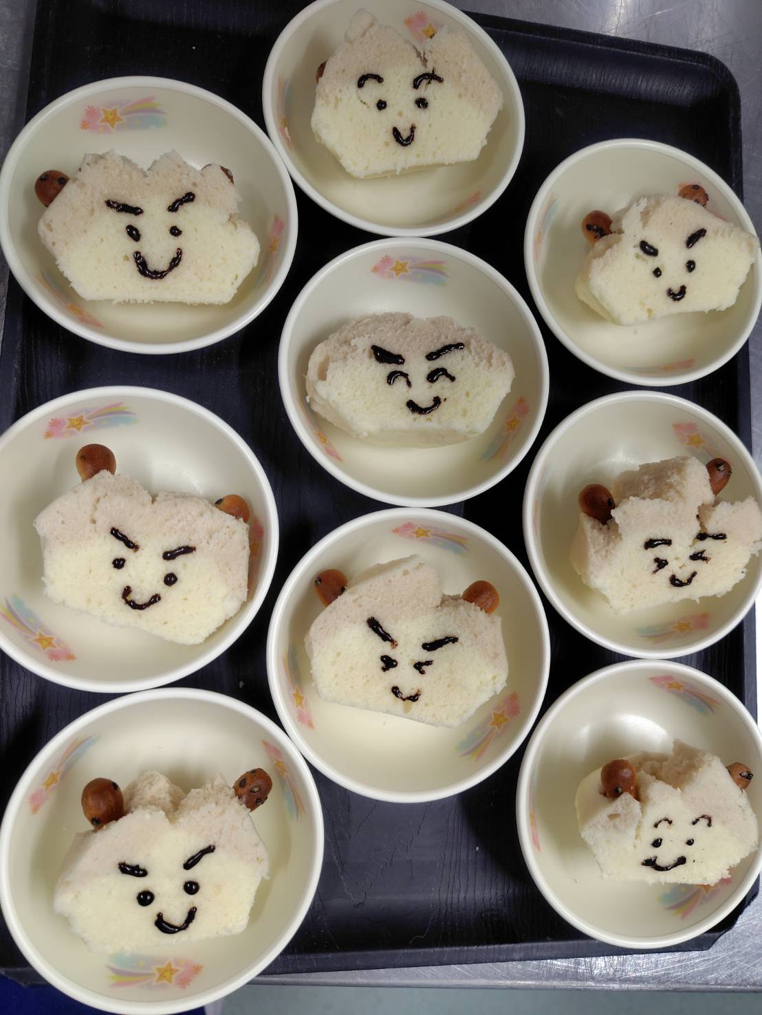 🫘節分メニューの紹介🫘 2026年02月18日 2月3日の節分の日には、鬼をイメージした「せつぶん蒸しパン」を作りました✨ 髪の部分はイチゴパウダーを混ぜてピンク色に、顔はココアパウダーと砂糖を混ぜて色々な顔を描きました♪ にっこり笑顔だったり、キリッとカッコいい顔だったり、みんなどの顔を食べたかな!? 無病息災を願って、みんな楽しく一年を過ごせるよう、給食室一同願っています😊