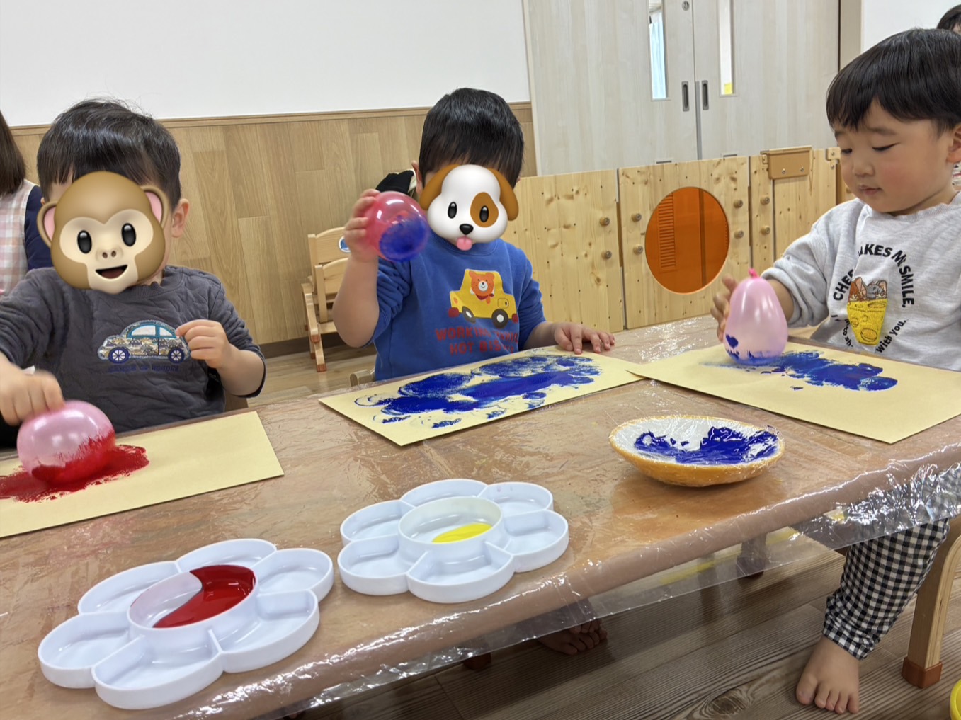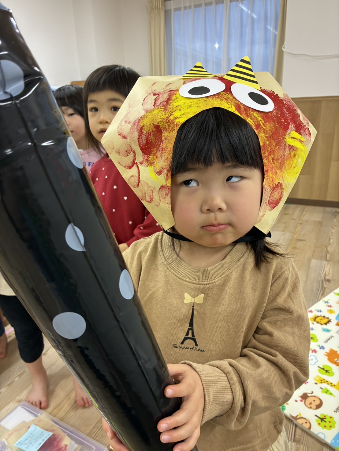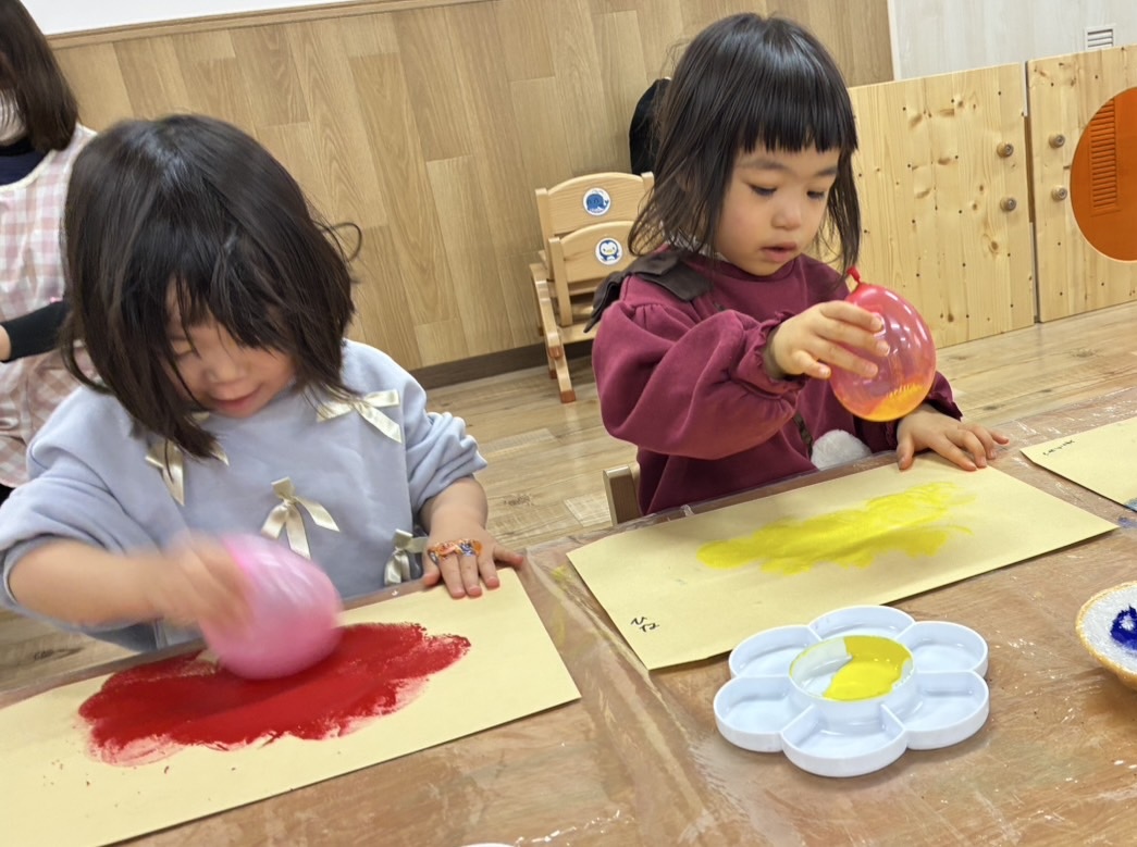 📕もくじぐみ📕 2026年02月26日 先日節分会に向けて 鬼のお面(被り物) の製作をしました👹 風船のスタンピングの 音を楽しみながら 「ぽんぽんするね」「楽しいね☺️」 と盛り上がり、 色が着いたり混ざったりするのをみて 「紫になったよ‼️」 と驚く姿もありました! 完成すると 「〇〇くんのお面はどんな感じ?」 「被りたい‼️」 と大人気でした😂 他にも 【おなかのなかにおにがいる】 と言う絵本を見ると 自分のお腹の中に鬼がいるのか、 保育者や友達に聞く姿があり面白かったです😂 節分会もたのしんでいましたよ😊