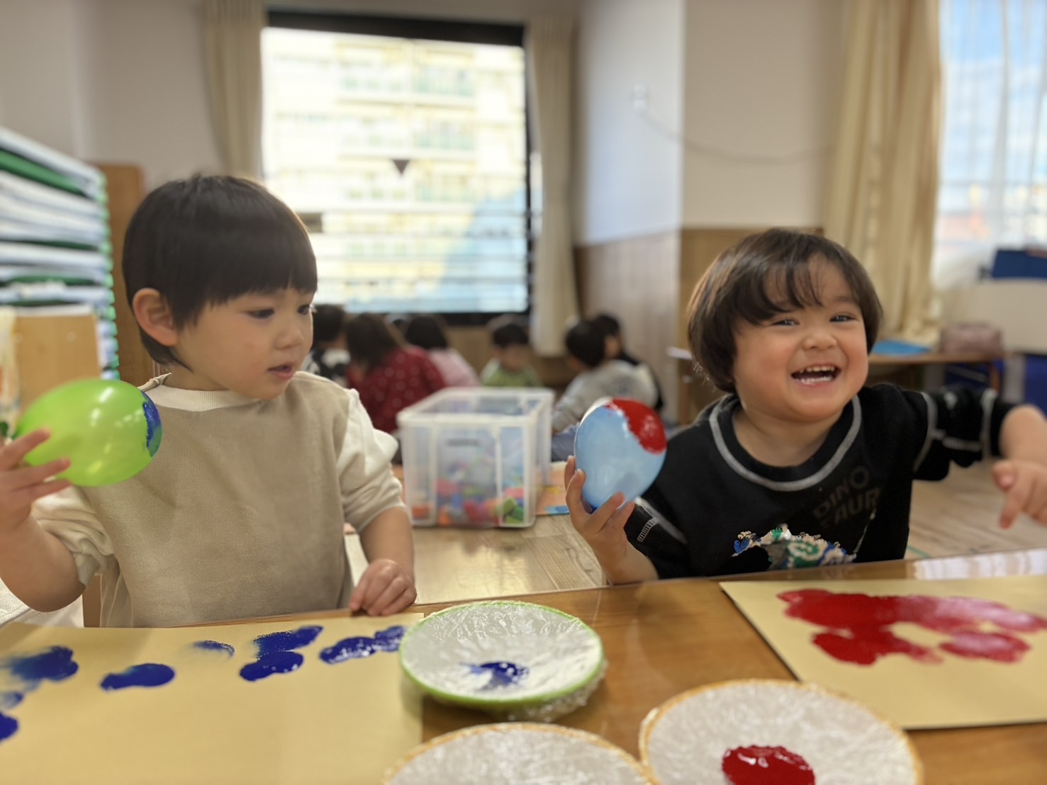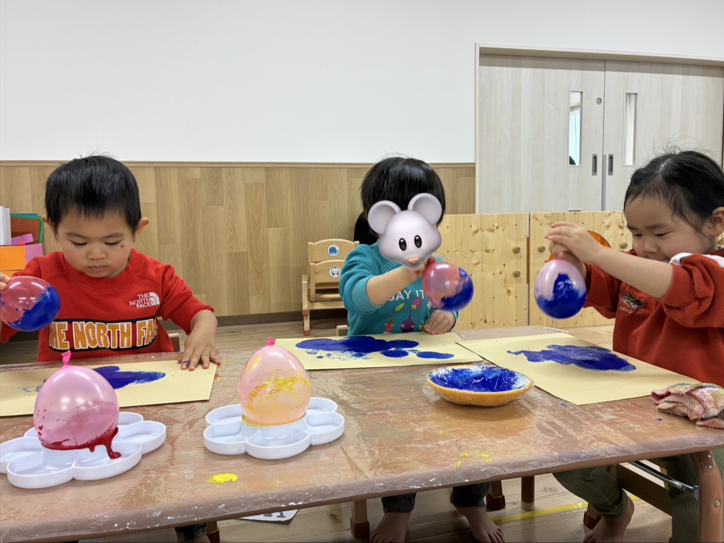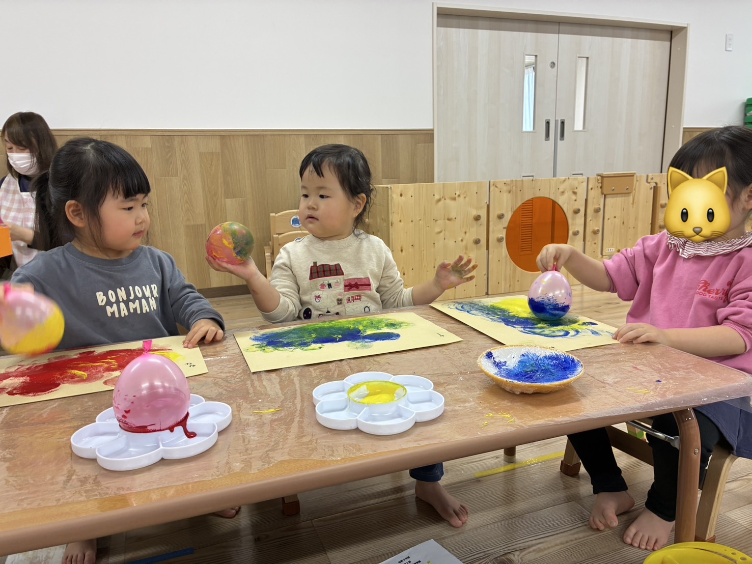 📕もくじぐみ📕 2026年02月26日 先日節分会に向けて 鬼のお面(被り物) の製作をしました👹 風船のスタンピングの 音を楽しみながら 「ぽんぽんするね」「楽しいね☺️」 と盛り上がり、 色が着いたり混ざったりするのをみて 「紫になったよ‼️」 と驚く姿もありました! 完成すると 「〇〇くんのお面はどんな感じ?」 「被りたい‼️」 と大人気でした😂 他にも 【おなかのなかにおにがいる】 と言う絵本を見ると 自分のお腹の中に鬼がいるのか、 保育者や友達に聞く姿があり面白かったです😂 節分会もたのしんでいましたよ😊