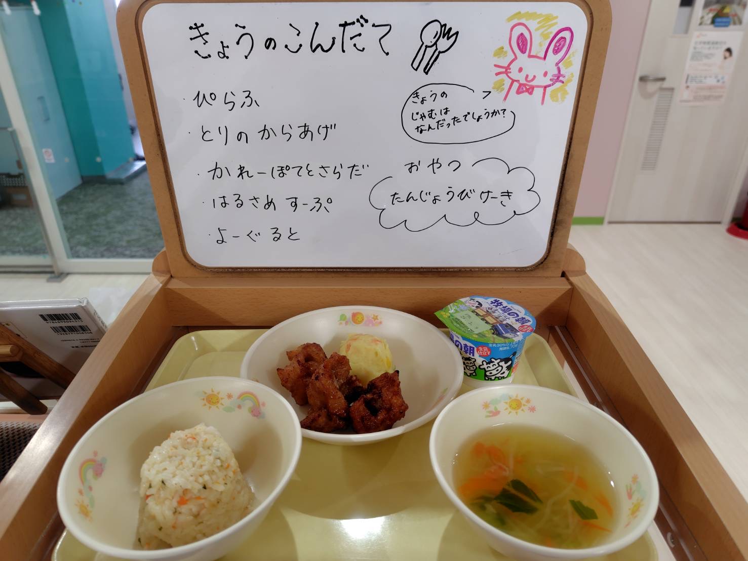 🎉誕生会メニューの紹介🎉 2026年02月28日 2月の誕生会メニューは、大人も子どもも大好きな「鶏の唐揚げ」にしました♪ そして、おやつの誕生日ケーキには、なんと「にんじん」で作ったジャムを飾り付けました🥕子どもたちには内緒で食べてもらい、食材当てクイズをしました😚 「カボチャだと思うなぁ」「みかんでしょ!」色々な意見が出ましたが、みんな美味しく食べてくれました✨ にんじんとみかん缶、砂糖で簡単に作れます♪興味のある方は、おうちでもぜひ作ってみてください😊 【お昼】 ・ピラフ ・鶏の唐揚げ ・カレーポテトサラダ ・春雨スープ ・ヨーグルト 【おやつ】 ・牛乳 ・誕生日ケーキ