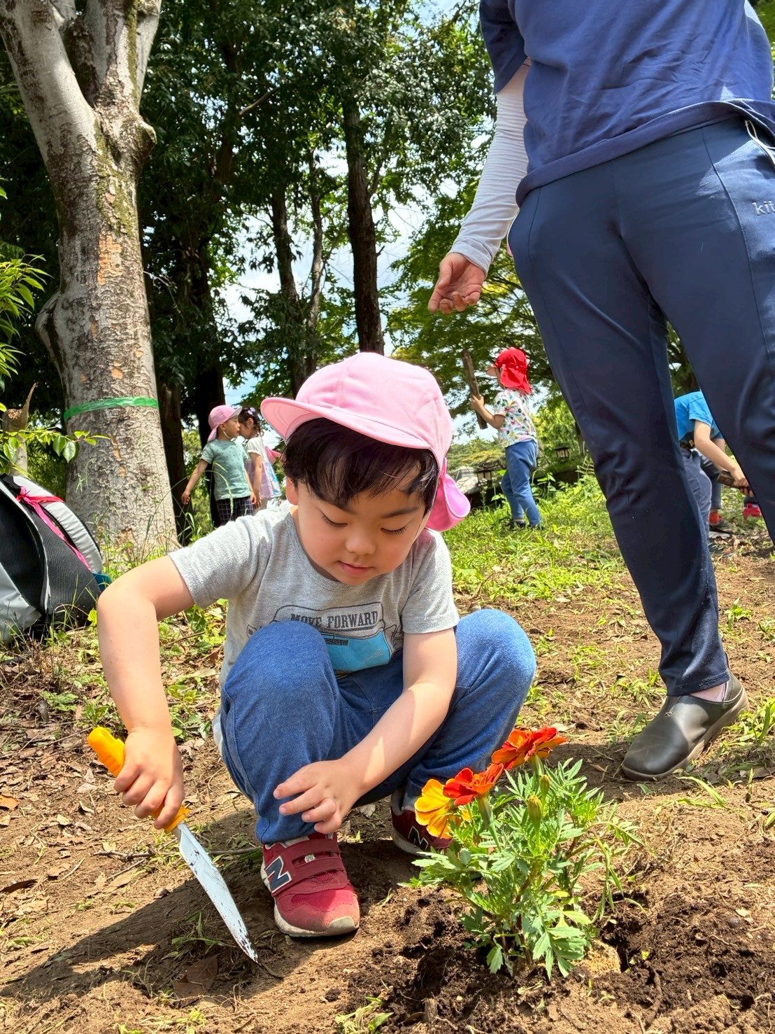 マリーゴールドの苗植えでは、慎重に取り組む表情も見られましたよ👀✨ 『これなあに?』と根っこの多さに驚いたり、土の硬さや柔らかさを感じたりと全身で良い経験をすることができました🪴